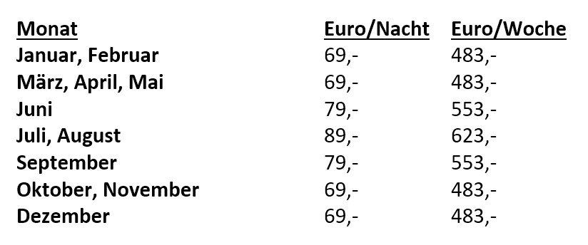 Die folgenden Preise beziehen sich jeweils auf eine Übernachtung bzw. eine auf Woche.